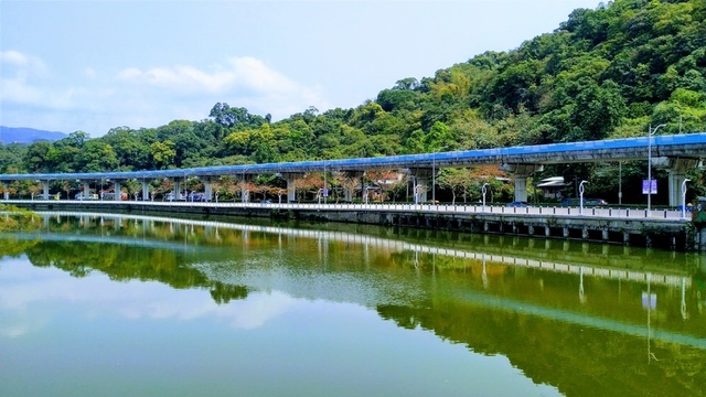 大湖公園一角,文湖線與遠山倒映在湖面上,畫出一道美麗的弧線。