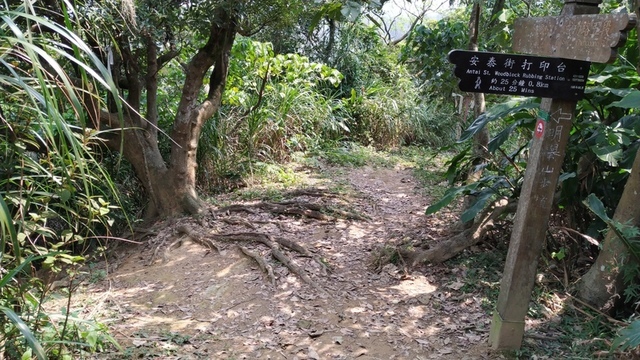 看完風景喘口氣繼續前進,隨著泥土階梯不斷的上上下下,穿過糾結的樹根與遮天的林蔭,充滿原始味的森林讓一路上充滿了冒險感,來到岔路,直行康樂山,左下安泰街水源頭福德宮,先取直行到基點再回頭。