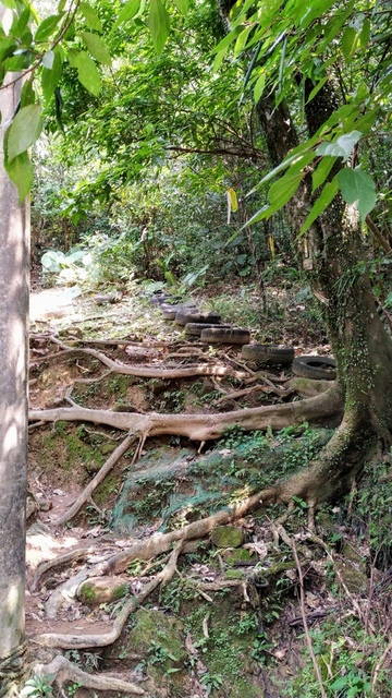 從明舉山登山口進入就是陡上的土路步道,有廢棄輪胎鋪設的階梯。