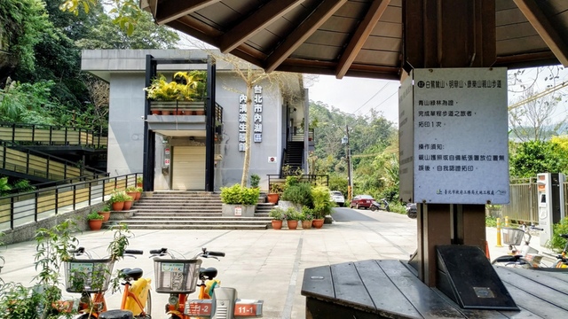 一路匆匆行到此岔,直行到步道終點內溝溪生態館,左往明舉山基點,取左。
