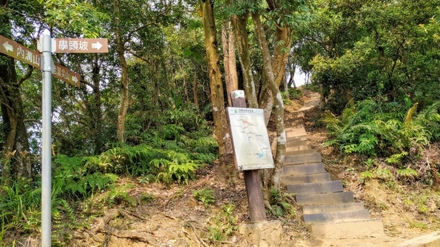 過學頭坡山後,步道轉為階梯,一路下到內溝山學頭坡山登山口,對面有座內溝山步道導引圖。