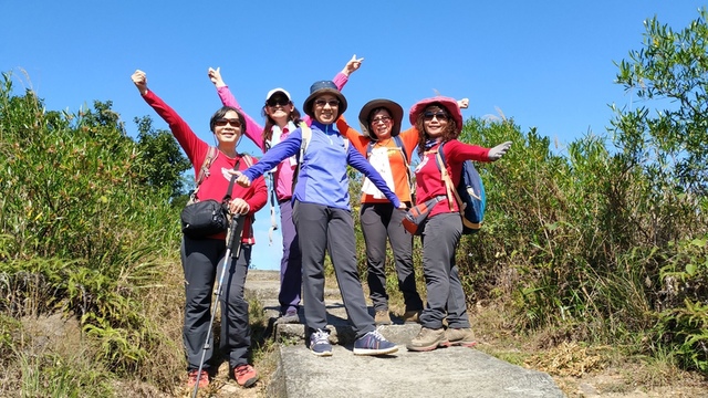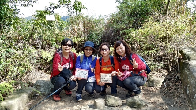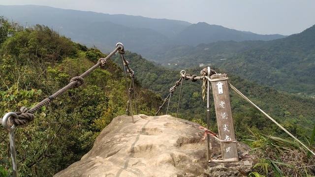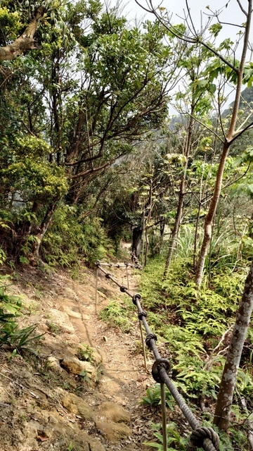 先是枕木階級一路向下,接著步道起伏不定,有些地方還得拉繩上下,終於來到老鷲尖南峰,此地海拔155m,立有聯勤測量隊僑六測量樁位。