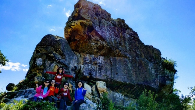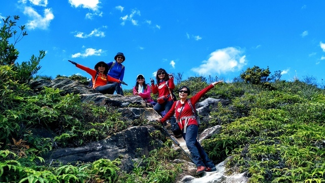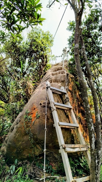 一路起伏,前有巨岩出現,可以選擇爬梯而上獲取左側繞腰通過。